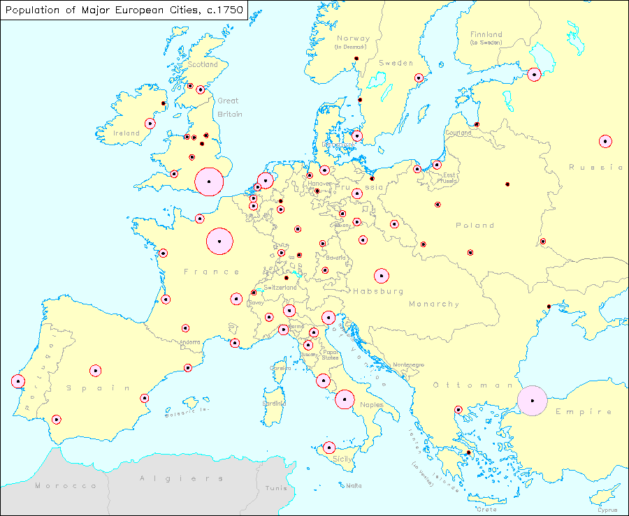 This map contains population data on European cities in 1750. When the cursor is moved to a diagram, the number